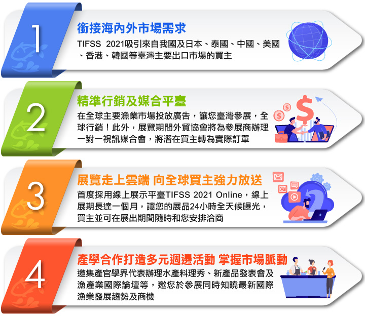 作為臺灣最專業的水產品及水產加工設備推廣平臺,2021年臺灣國際漁業展(TIFSS 2021)推出O2O虛實整合服務,提供參展商免費線上展虛擬攤位,線上線下雙管齊下,匯聚國內外漁業廠商及專業買家,協助業者在疫情下推銷臺灣優質的漁水產品、設備及技術到海內外。