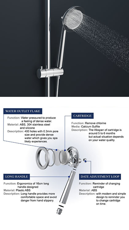 The product is equipped with a replaceable filter cartridge to ensure continuous filtration. Its detachable SS shower nozzle, wrapped in a rubber design for safety, allows easy cleaning. The use of calcium sulfite in the filter enhances the removal of residual chlorine with higher efficiency.