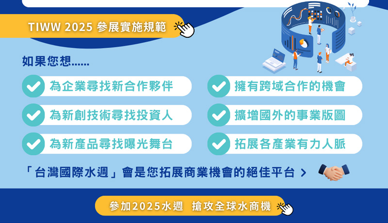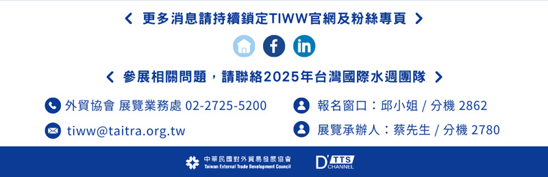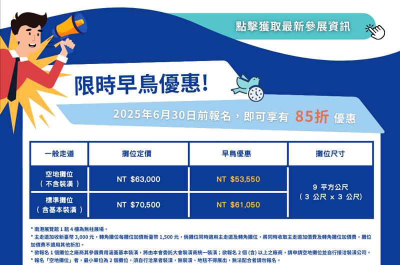 6月底前報名即享 85 折早鳥優惠,邀請您一同在今年度的水週搶攻無限商機!